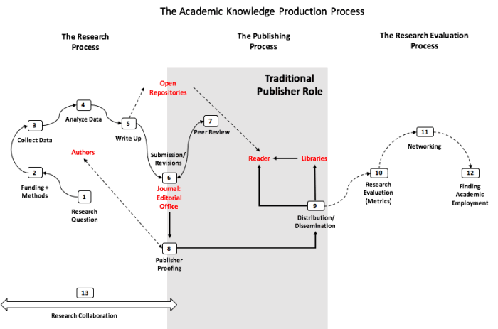 The diagram below presents a simplified depiction of the various stages involved in the academic knowledge production process. We divided this into three connected sections; the research process, the publishing process, and the research evaluation process. The research process is comprised of the various stages that researchers go through to get a paper ready for review including, access to fundings, data collection and analysis, and writing up the research. The publishing process describes the stages that publishers were traditionally involved in, mainly coordinating review process and dissemination of the content produced. The research evaluation process has a direct influence on the researcher’s ability to do professional networking and ultimately find interesting academic employment. These processes are in fact cyclical as the ability to network and find academic employment will have a direct influence on the researcher’s ability to produce subsequent papers. The arrow at the bottom left corner represents the various stages at which research collaboration takes place.